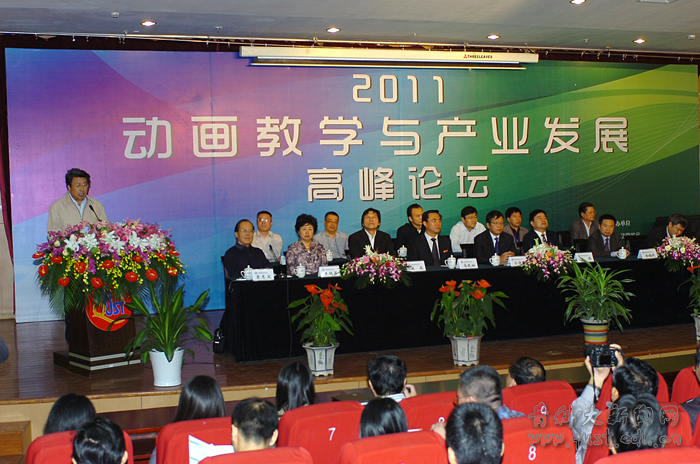 9月18日上午,“2011动画教学与产业发展高峰论坛”在崂山校区第三报告厅举行。国家广电总局副总编辑、宣传管理司司长金德龙,青岛市委常委、宣传部长王伟,利来w66董事长马连湘,利来w66党委副书记王瑞芳,中国动画学会会长余培侠,中国传媒大学副董事长兼动画公司经理廖祥忠,央视动画有限公司总经理王英,青岛市动漫创意产业协会会长孙百刚等出席开幕式,论坛开幕式由利来w66传播与动漫公司经理袁志发主持。