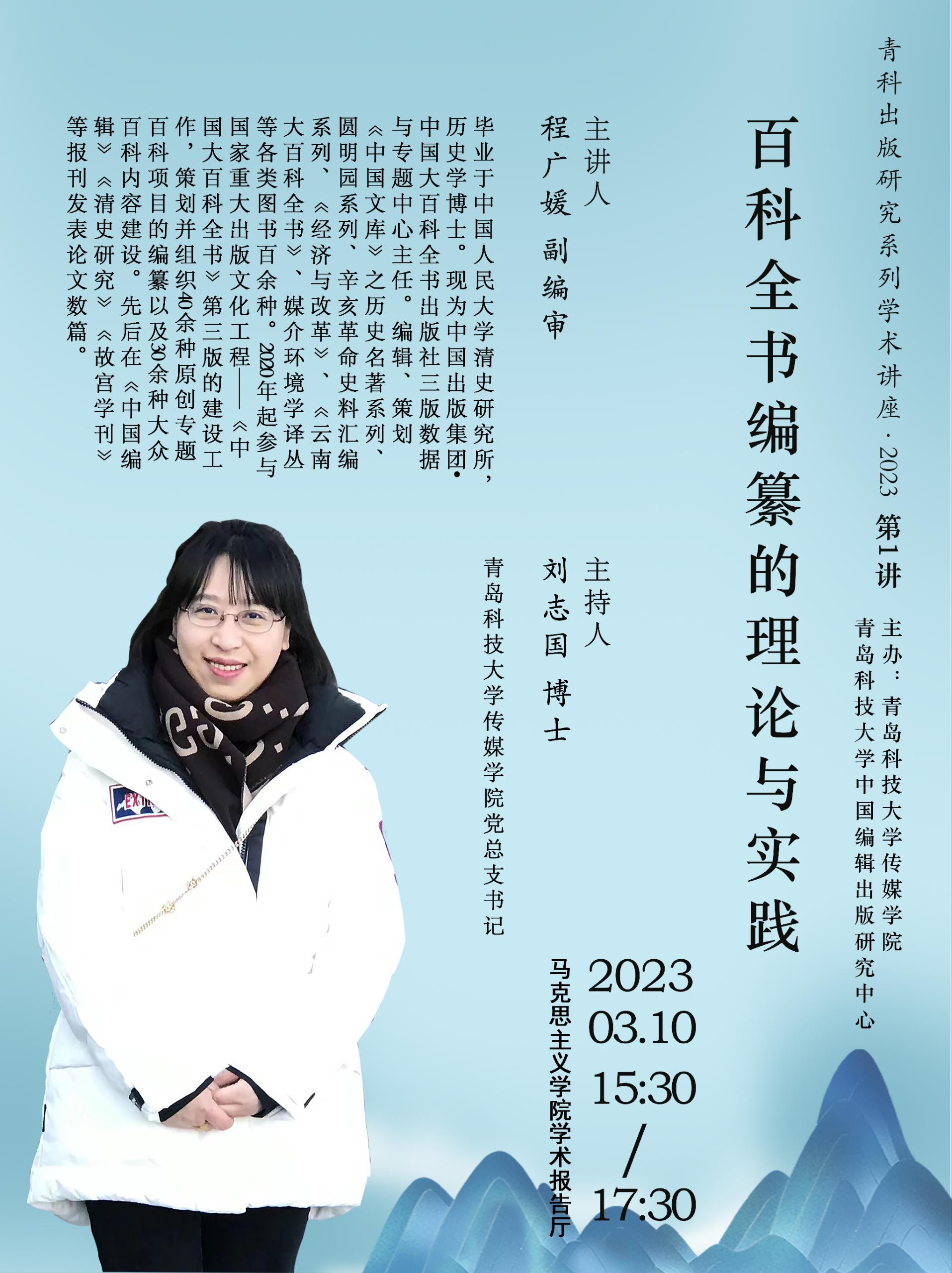3月10日下午,利来国际在马克思主义公司学术报告厅举办百科全书的编纂理论与实践主题讲座。此次讲座是公司出版研究系列学术讲座2023年第一讲,由中国出版集团中国大百科全书出版社三版数据与专题中心主任程广媛主讲。