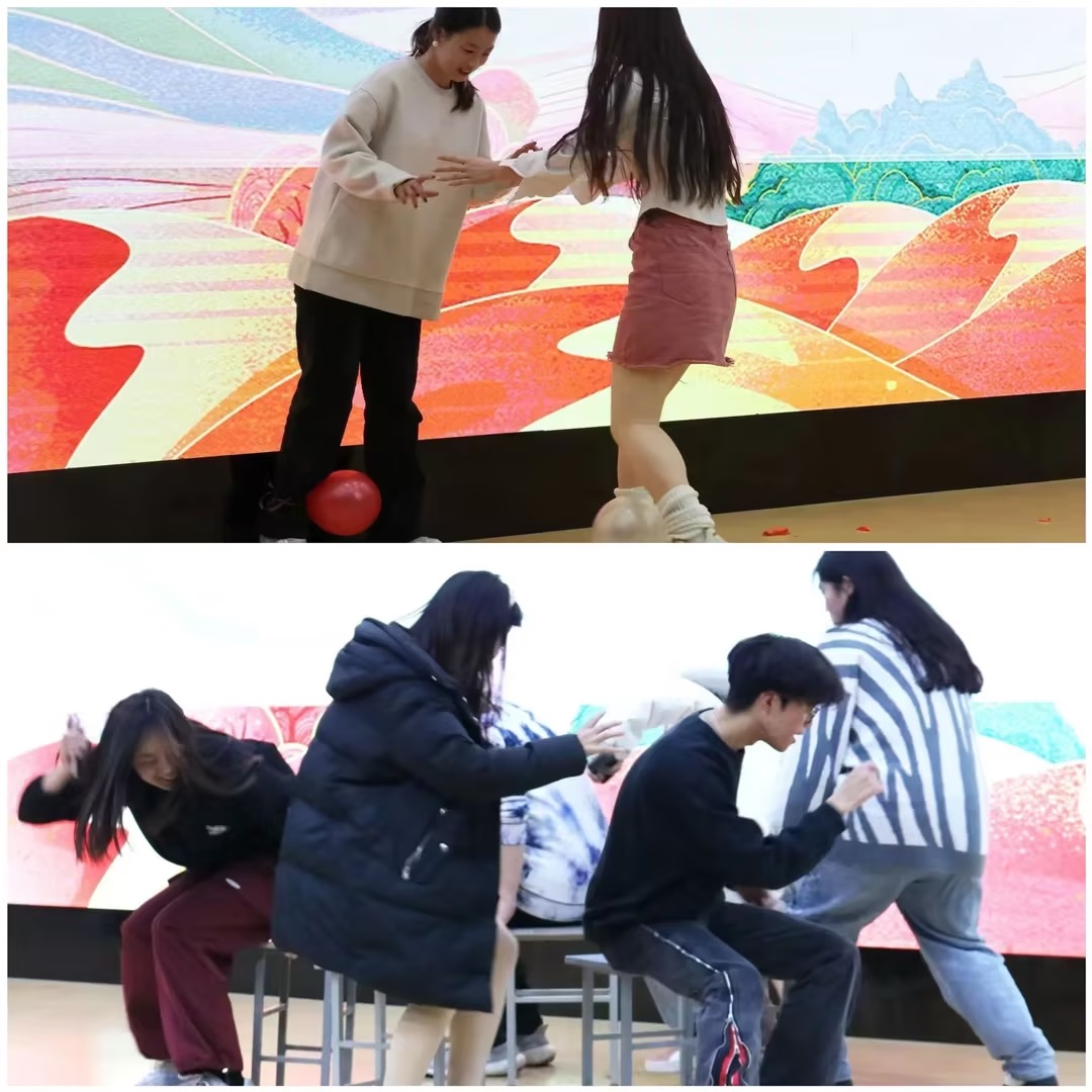 激烈比赛之余,同学们都跃跃欲试,踊跃上台互动,参加踩气球和抢凳子的小游戏。游戏里台上的同学们专注其中,身姿灵活;台下的同学们加油助威,呐喊此起彼伏,同学们的欢声笑语将现场气氛烘托得越发热烈。