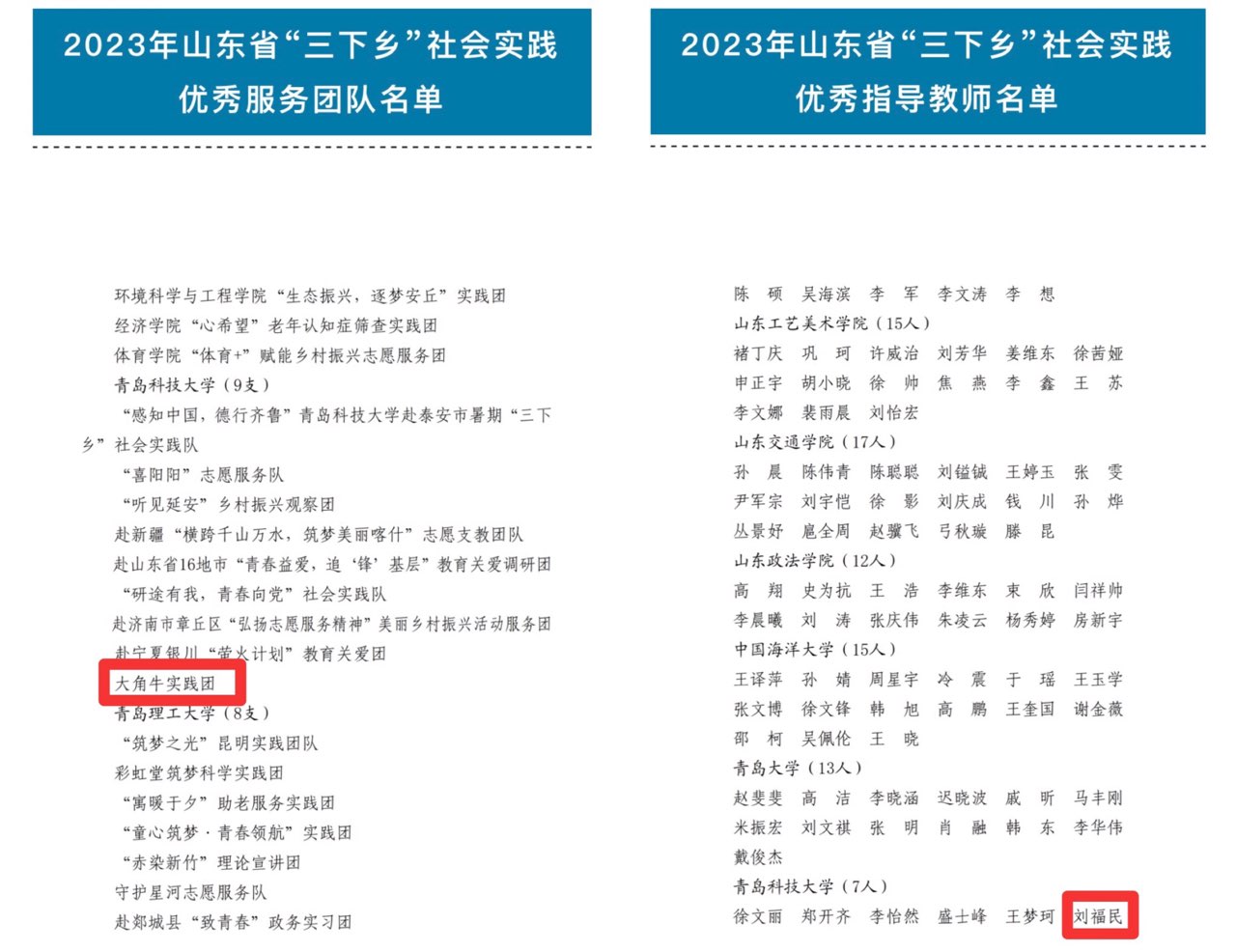 近日,共青团山东省委联合省委宣传部、省教育厅等单位对在2023年“调研山东”——暑期“三下乡”社会实践活动中表现突出的单位、团队和个人进行通报表扬。利来国际“大角牛实践团”获评省级“优秀服务团队”称号,辅导员刘福民获评省级社会实践“优秀指导教师”称号。