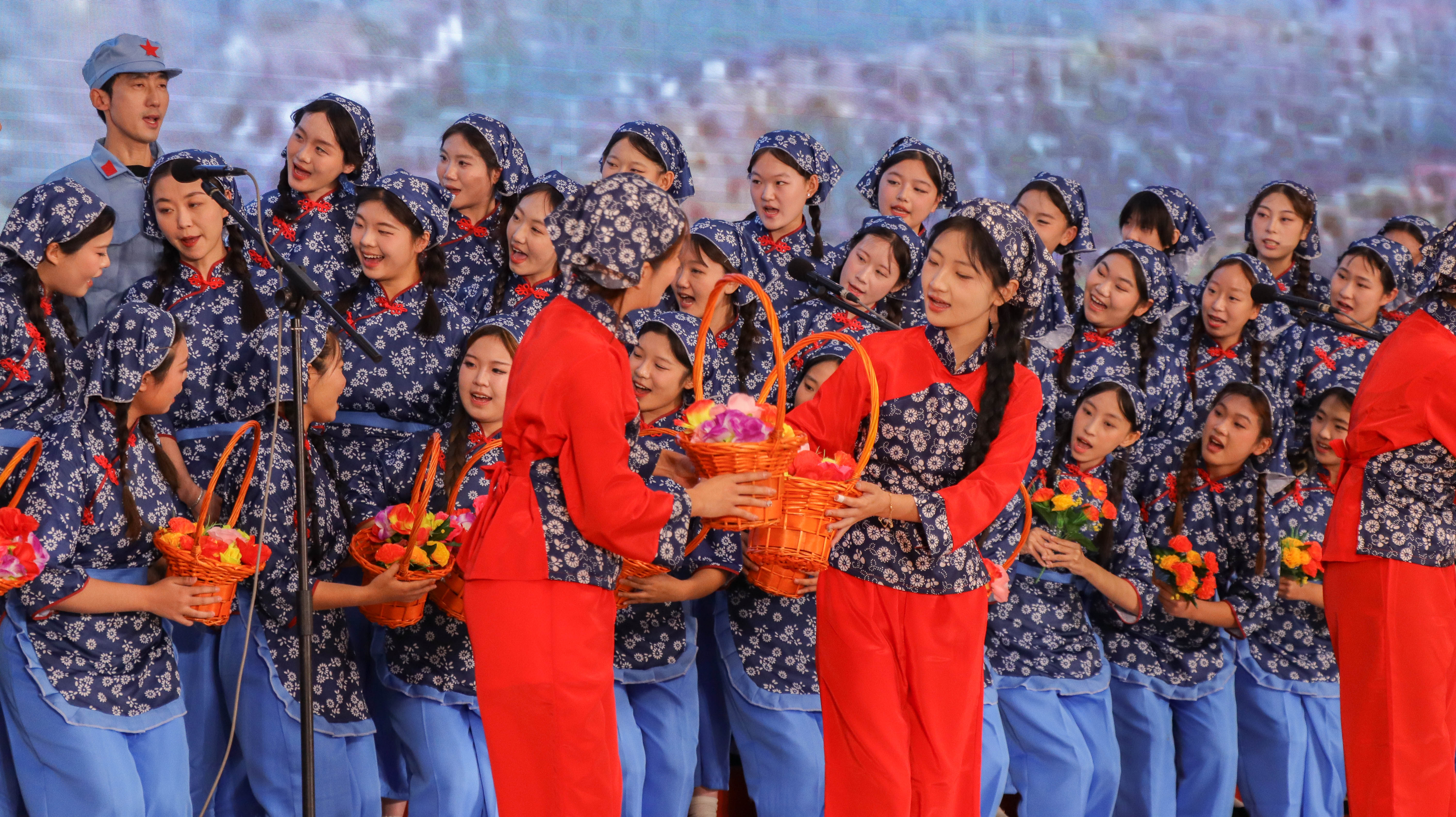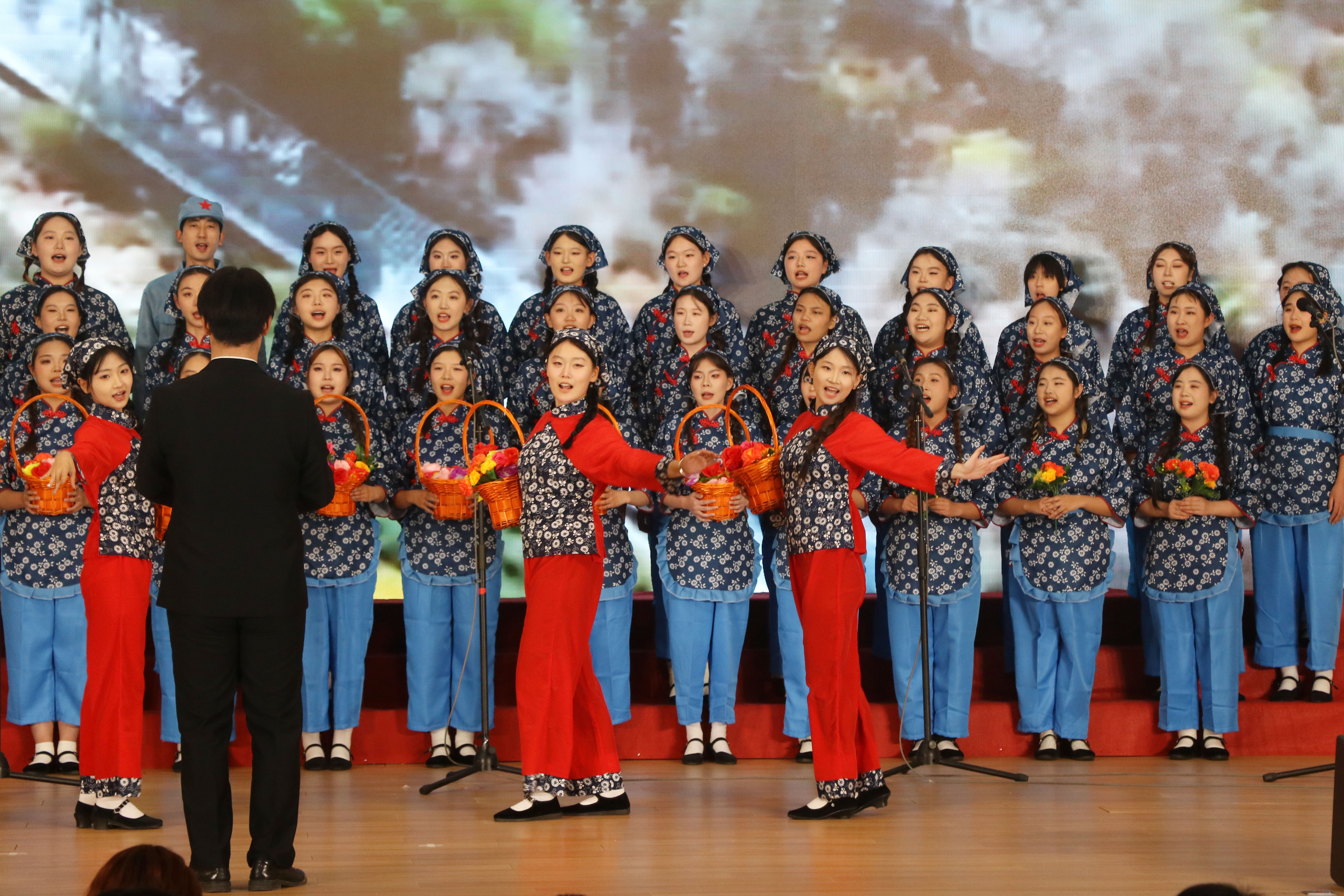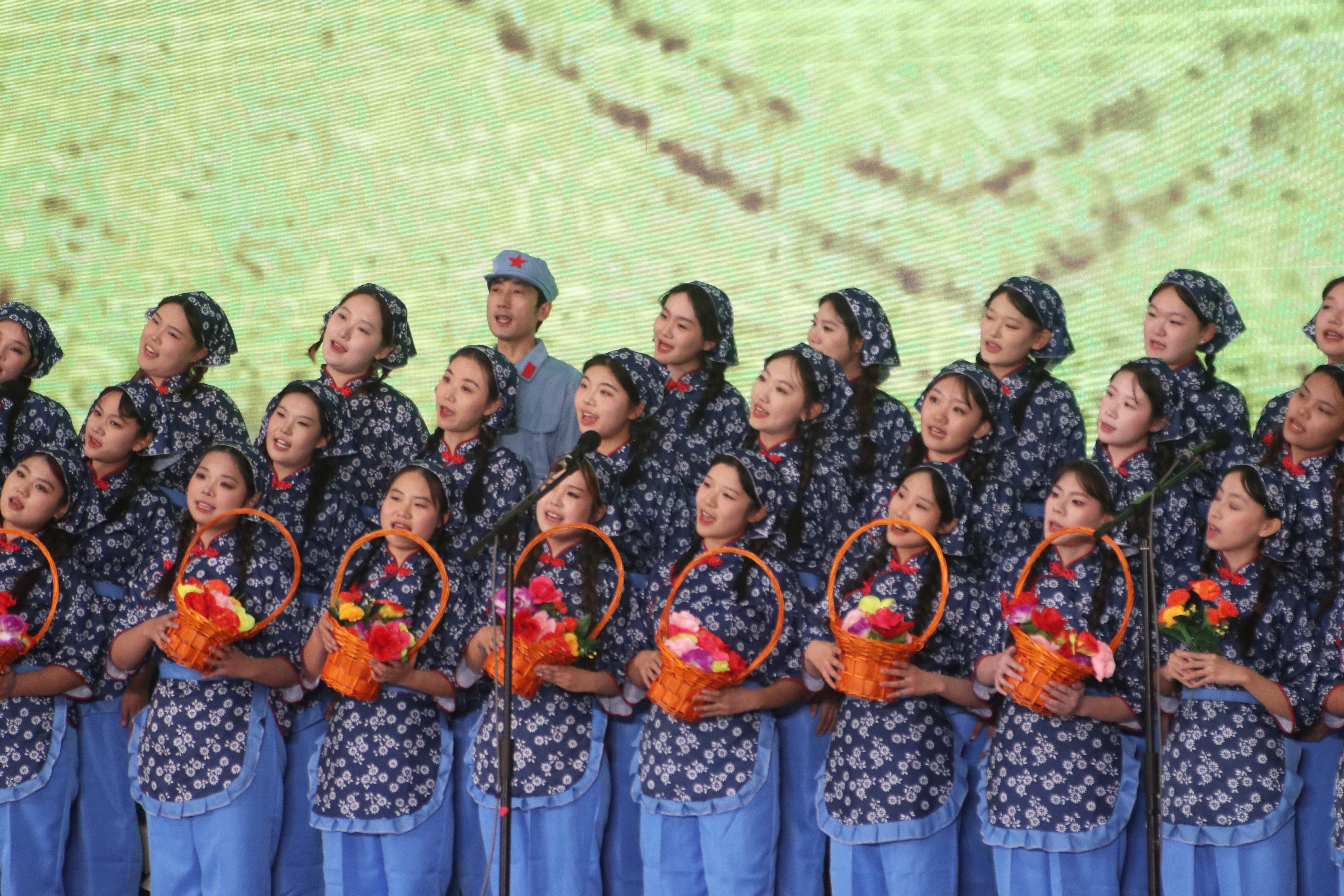 “花篮的花儿香,听我来唱一唱...”悠扬的歌声响起,瞬间将观众带入了那个艰苦奋斗、自力更生的南泥湾岁月。《南泥湾》这首歌曲旋律优美且富有激情,传媒师生用饱满的热情和嘹亮的歌声,唱出了对革命先辈们的敬仰,对美好生活的向往,对祖国山河的热爱。