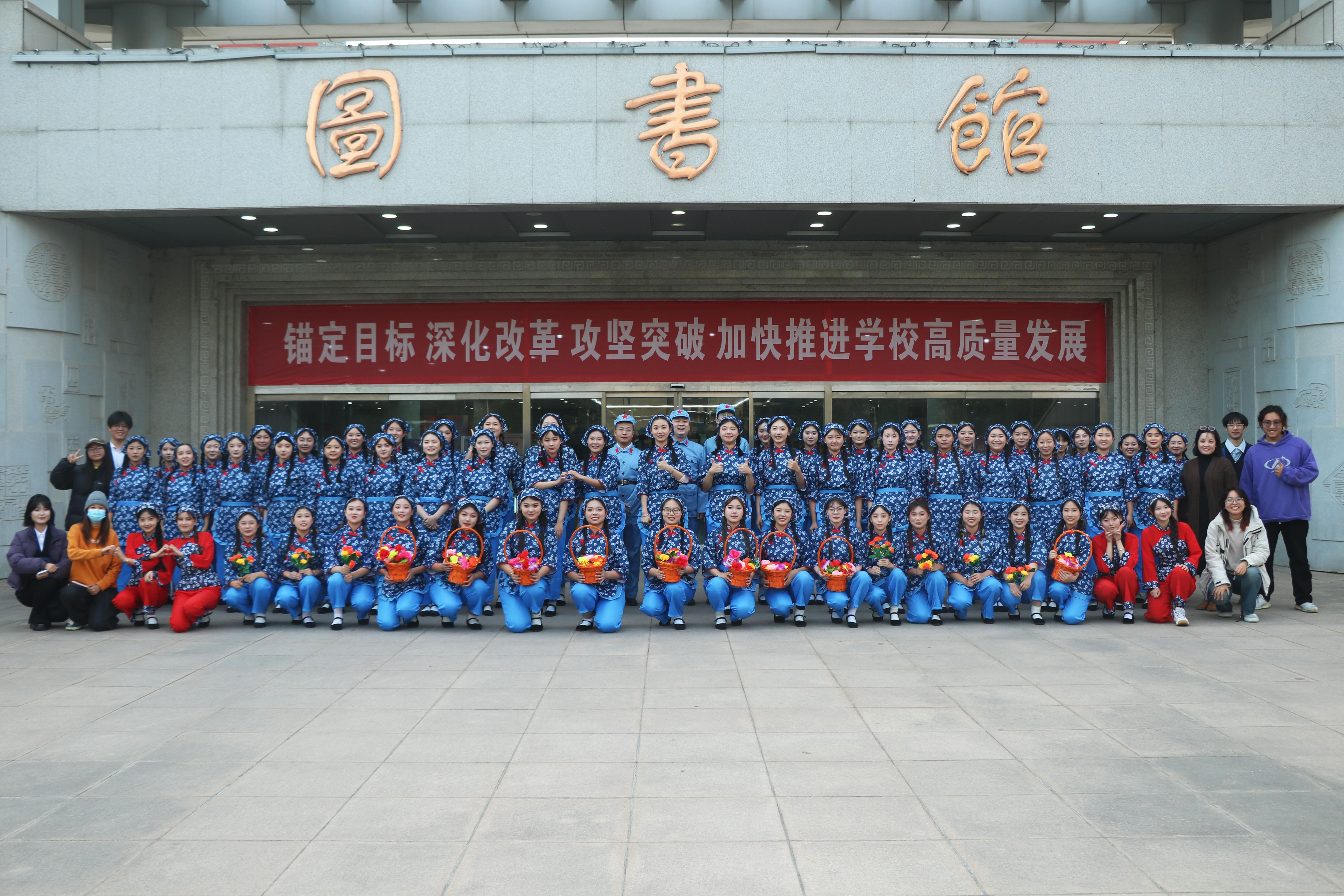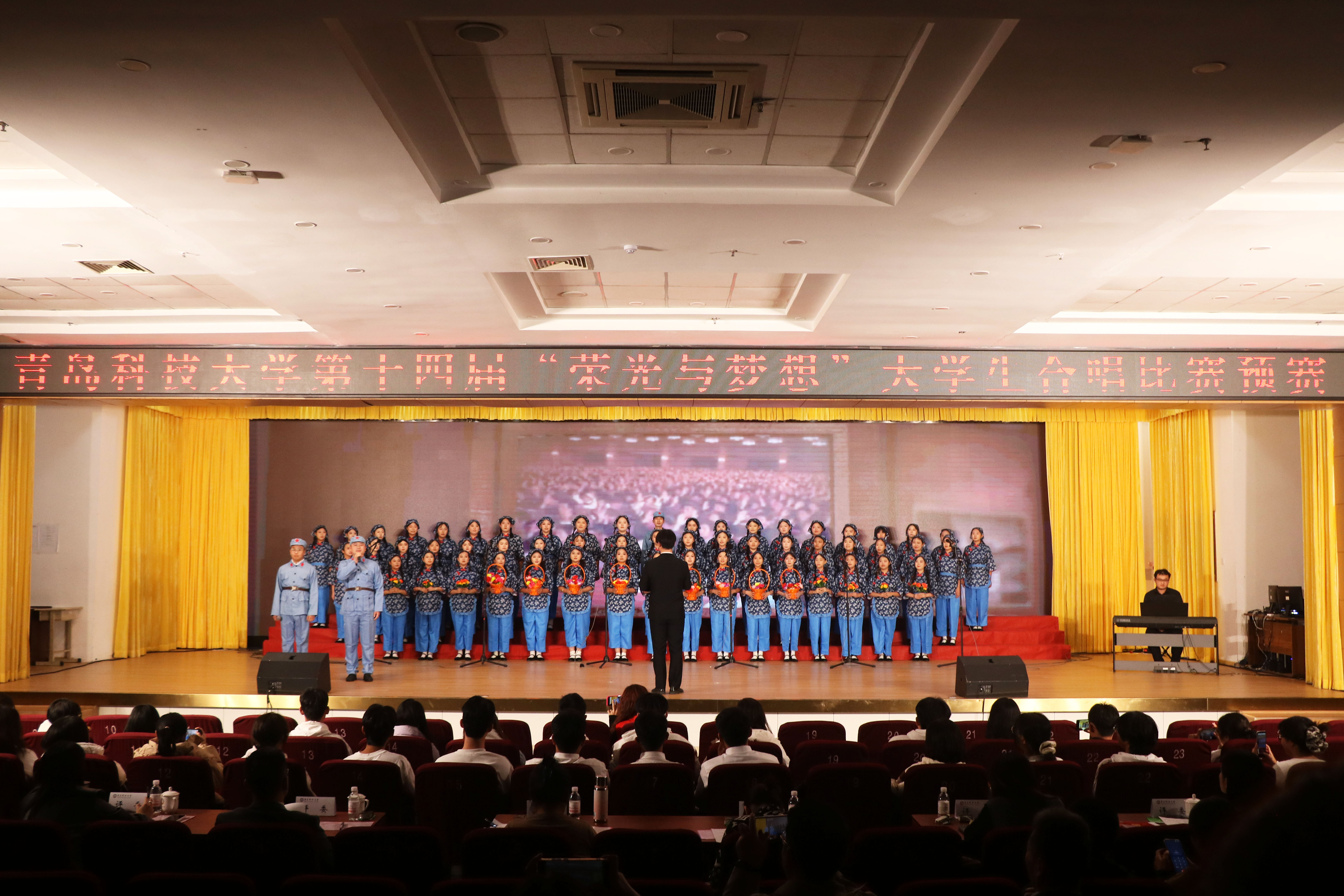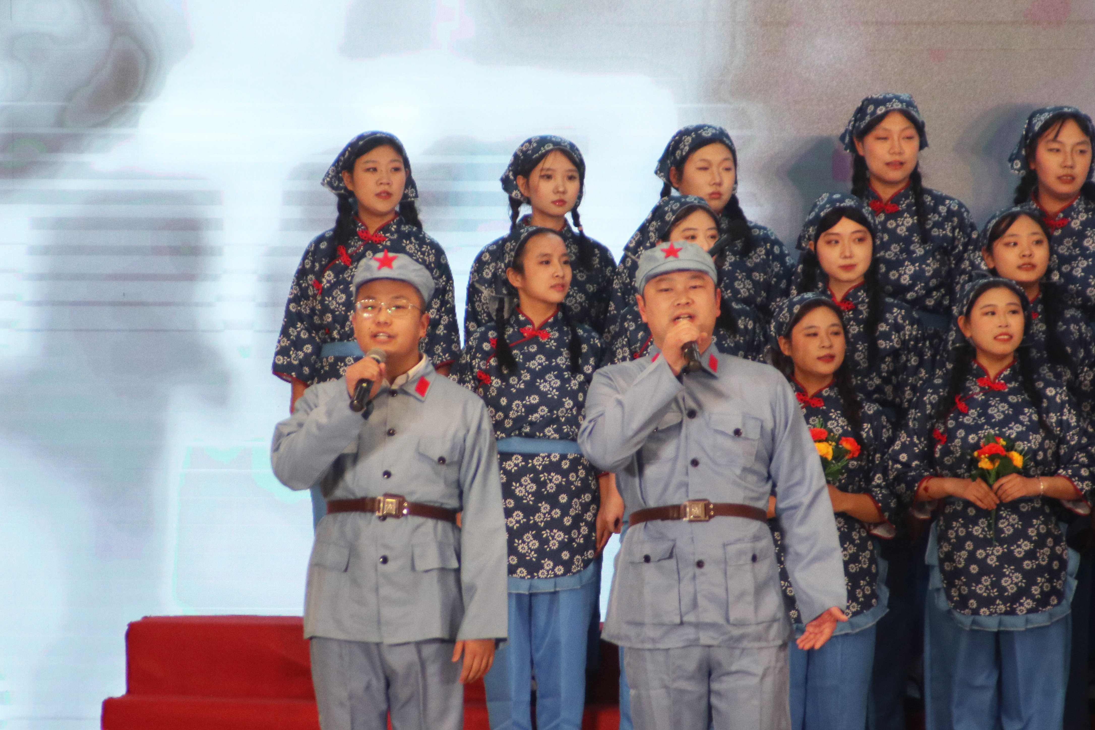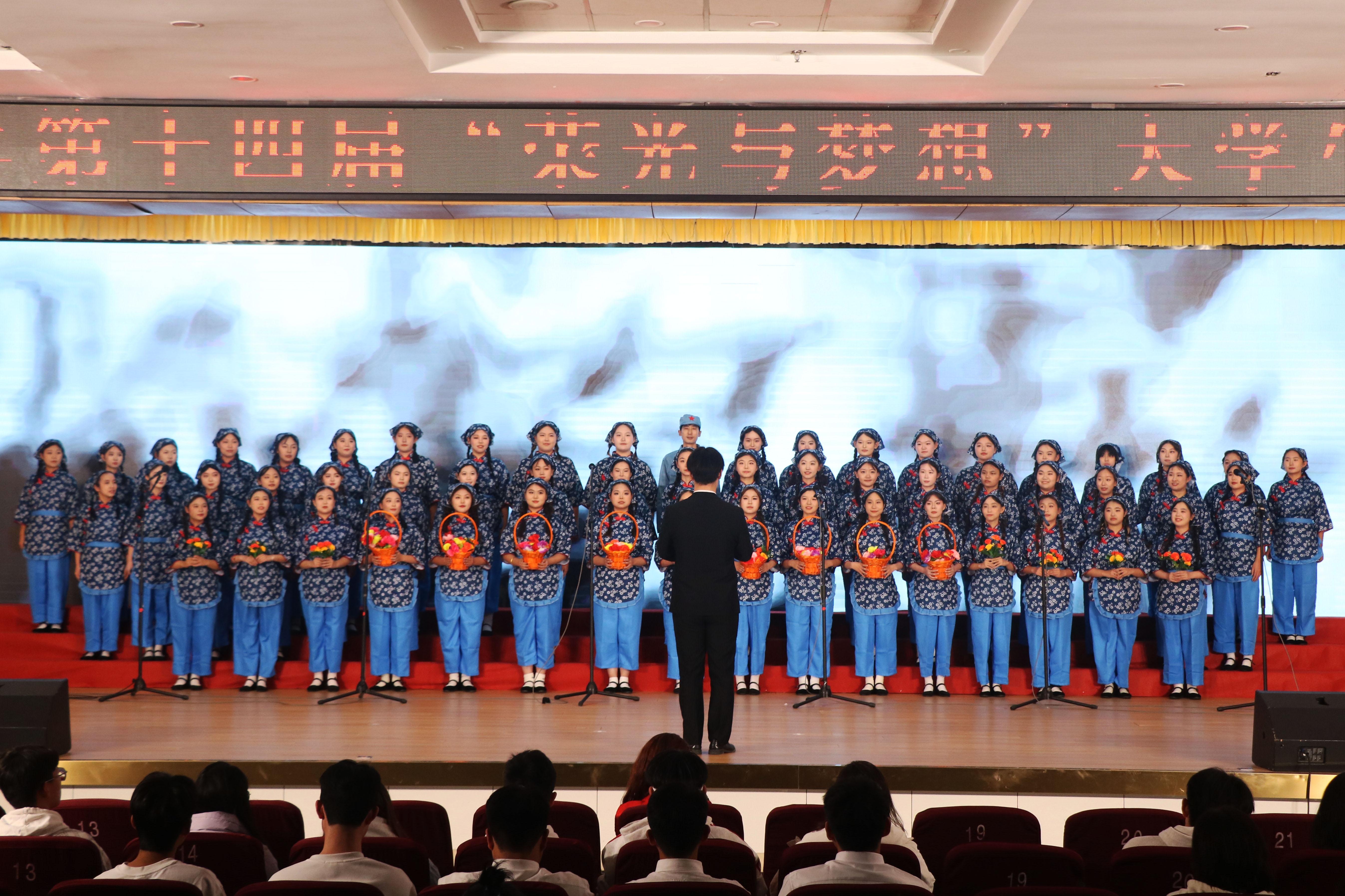 “花篮的花儿香,听我来唱一唱...”悠扬的歌声响起,瞬间将观众带入了那个艰苦奋斗、自力更生的南泥湾岁月。《南泥湾》这首歌曲旋律优美且富有激情,传媒师生用饱满的热情和嘹亮的歌声,唱出了对革命先辈们的敬仰,对美好生活的向往,对祖国山河的热爱。