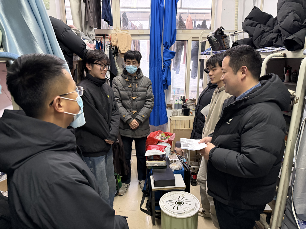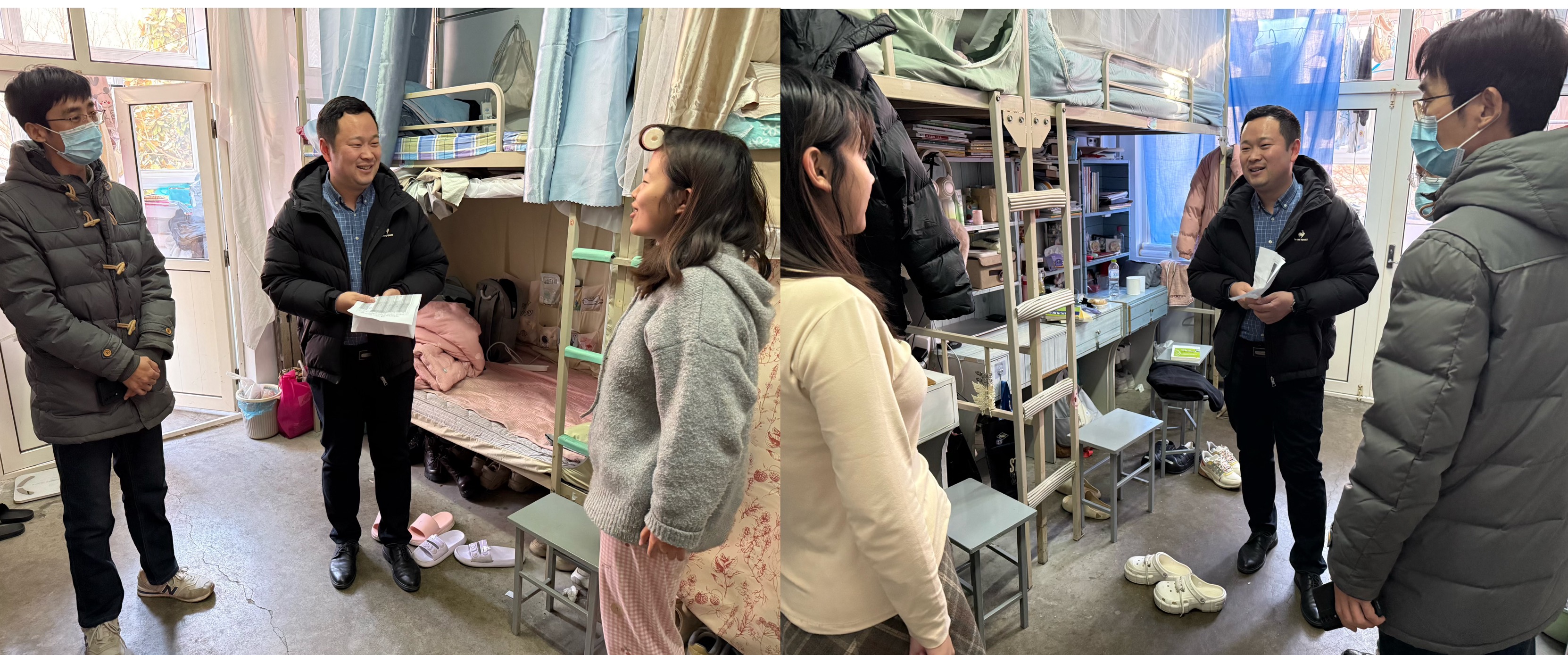 “期末考试还有几门?目前复习进展如何?宿舍暖气热不热?学习生活有啥困难需求?领导老师来访员工应该怎么做?”走访期间,领导老师们与员工深入交流,详细关心同学们的期末考试和生活情况,鼓励同学们积极备考,认真复习,强调了宿舍安全、内务卫生、宿舍文明礼仪等事宜,并指导同学们放假离开宿舍时关好门窗,断水、断电,做好宿舍卫生清洁,做到“离校即返家”,科学规划寒假生活。