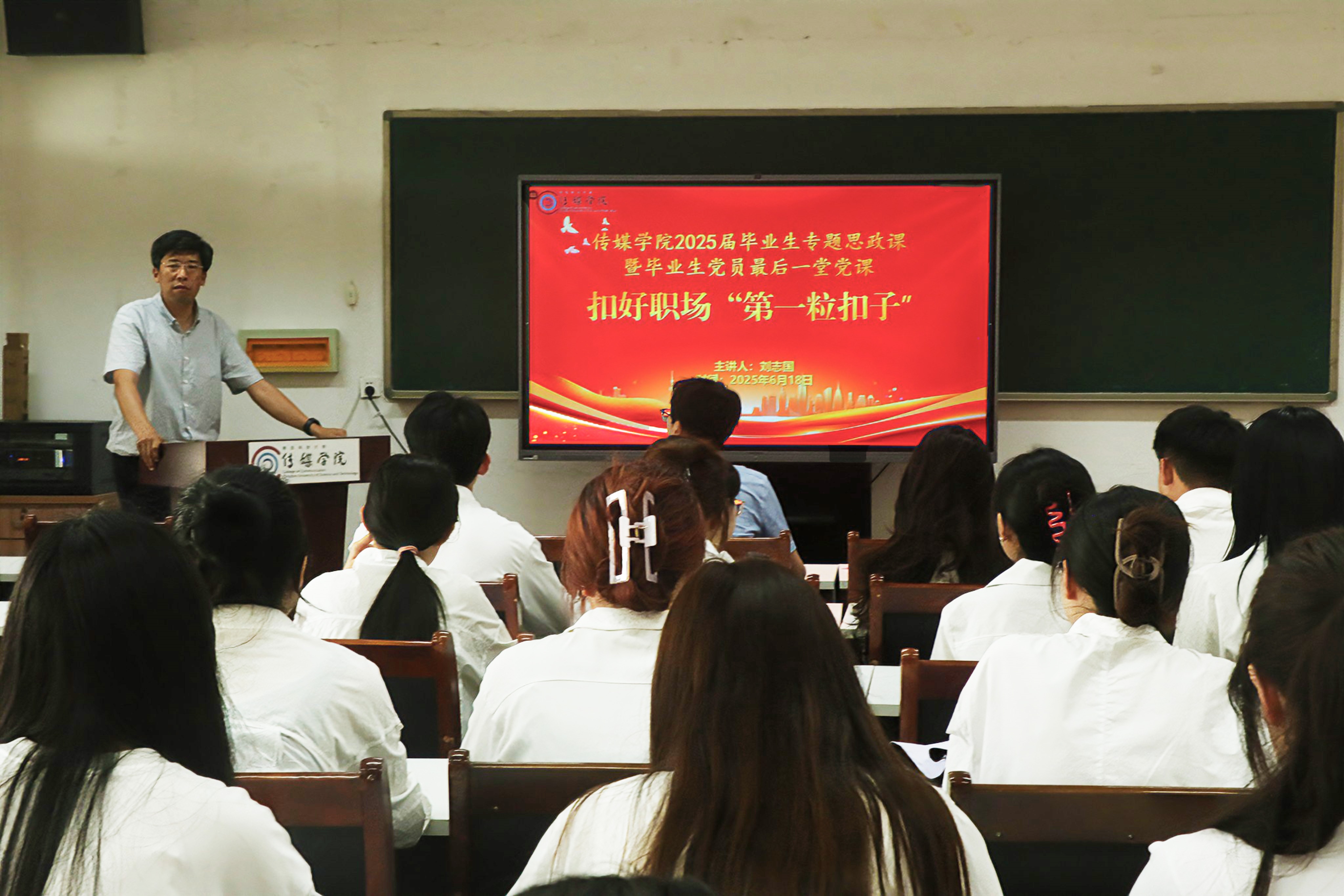 深化老员工思想政治教育,强化毕业生党员理想信念,6月18日下午,传媒公司党委书记刘志国以扣好职场第一粒扣子为题公司310会议室讲授2025届毕业生专题思政课暨毕业生党员最后一堂党课课堂由公司辅导员赵岩主持。