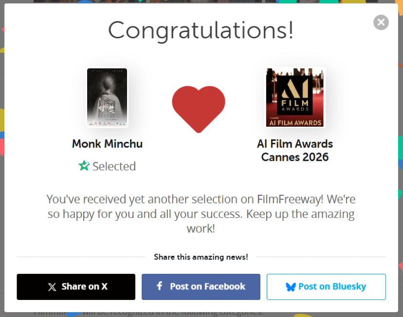 截至目前,《僧珉楚》已接连斩获多项国际电影节认可,成功入围戛纳人工智能电影奖、巴厘岛国际人工智能电影节、中加国际电影节、韩国人工智能电影节、意大利列蒂国际电影节、纽约国际电影奖、波兰Subtelny电影与人工智能电影节、莫斯科国际短片电影节、保加利亚“动画脉动”电影节等多个国际影展。佳绩频传,步履不停,让我们共同期待《僧珉楚》在国际舞台上续写更多精彩!