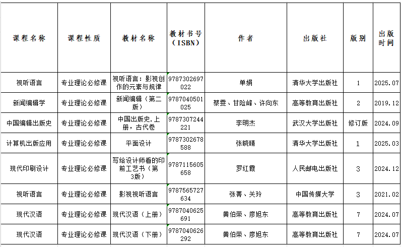 根据教务处《关于做好2025-2026学年第一学期教材选用征订工作的通知》安排,由任课教师提交教材选用建议,经利来w66传媒公司本科教材工作小组集体审议,现将2025-2026学年第一学期本科教材选用情况予以公示。