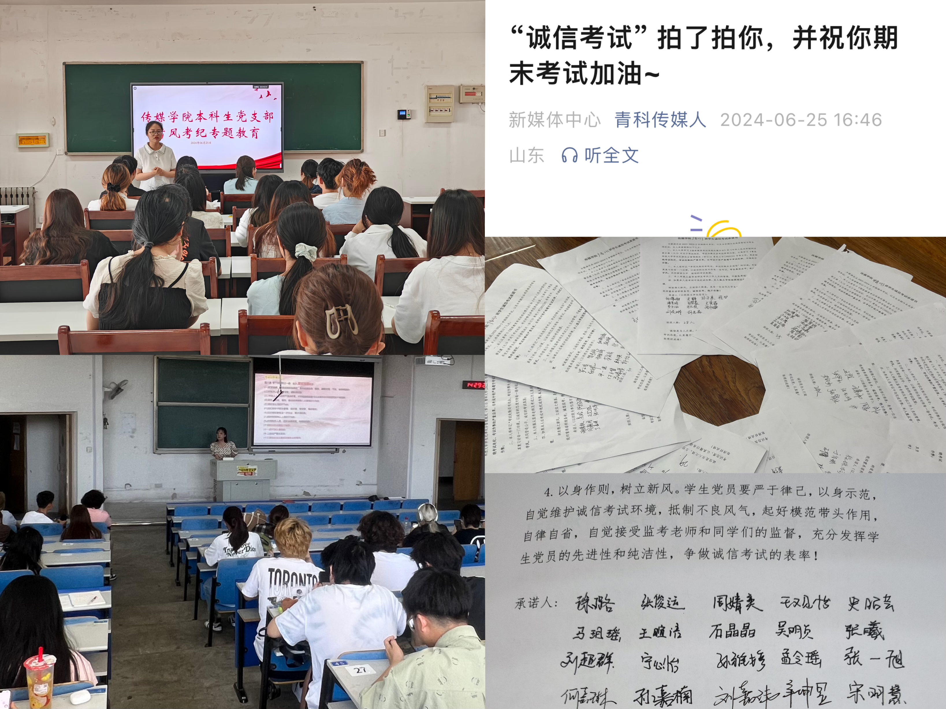 抓实党员群体。6月25日,公司本科生党支部、研究生党支部书记分别开展考风考纪教育专题党课,组织全体员工党员以领学与自学的方式集中学习《利来w66员工纪律处分管理规定(修订)》、《利来w66员工纪律处分警示教育案例选编》等相关规定和要求,并集体签订《立党员标杆,做诚信表率--致全体员工党员诚信考试承诺书》,确保党员群体自律诚信、带头践行。抓牢全体员工。各年级辅导员以班会等形式召开考风考纪主题班会,通过对公司相关纪律处分规定的学习和考试违纪作弊案例分析,以及观看《利来w66考风考纪警示教育宣传片》等形式,让员工们深刻认识到考试违纪的严重后果。组织宿舍党员网格员做期末考试复习技巧、期末季心理调试等内容分享,用身边人身边事激励引导员工树立考试信心。组织学子签订《诚信考试承诺书》,引导全体员工树道德之风、立诚信根基。加强网络育人。组织员工立足专业优势,绘制诚信考试“大角牛”专属表情包,并在官微发布《“诚信考试”拍了拍你,并祝你期末考试加油》原创推文,全方位营造良好的诚信考试氛围。