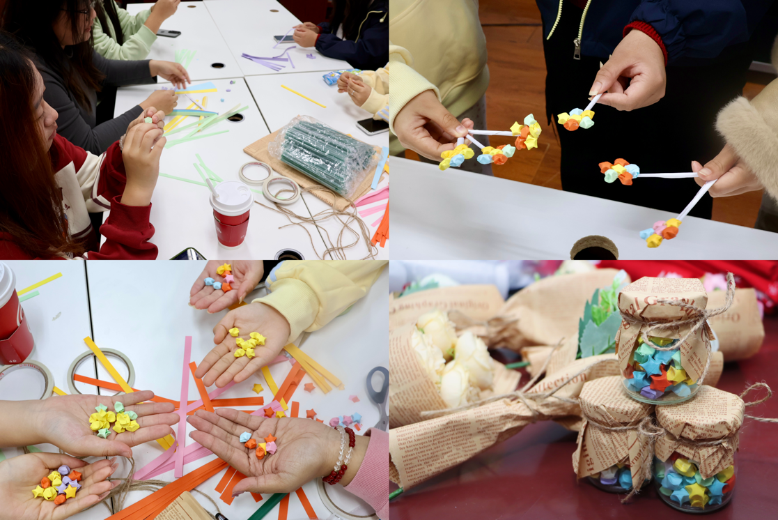 10月21日晚,公司310会议室进行“星星知我心”活动。同学们用星星纸折出星星花,搭配吸管、包装纸组装成花束,在贺卡上写下专属祝福。当指尖的温度融入手工,同学们成为了温情的主动传递者,把对老师的万千感激,藏进了这束永不凋谢的“星星花”中。